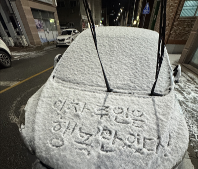 이 날, 기분이 그렇게 좋지 않아서 아~ 집에가면 혼자 짜배기 한병 까고 자야지 라고 생각하며 숙소에 왔는데, 어떤 놈인지 모르겠지만, 내 차에 낙서를 했다. 아주 덕담으로 ㅎ. 솔직히 차에 기스났는지 확인했다. 근데 이 날 기분이 썩 좋지 않았는지, 감동의 눈물을 속으로 흘렸다. 연말에 얼굴 모르는 누군가에게 받은 위로였다. (의도는 뭔지 정확히 알 수 없으나..!)